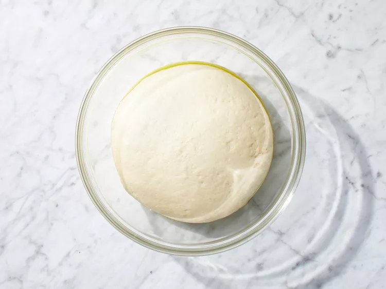 Lightly oil a large bowl. Place dough into the bowl and turn to coat with oil. Cover with a damp cloth and let rise in a warm place until doubled in volume, about 45 minutes.