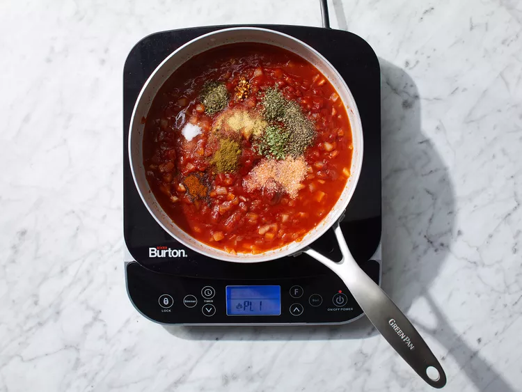 Stir in tomato paste, water, salt, sugar, oregano, garlic powder, basil, marjoram, cumin, chili powder, red pepper flakes, and black pepper; simmer for 15 to 20 minutes.