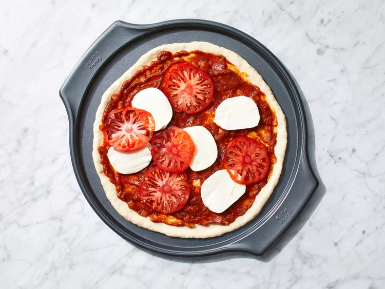Divide dough in half. Roll each half into a 12-inch circle. Place dough onto two 12-inch pizza pans; cover with sauce and mozzarella cheese.