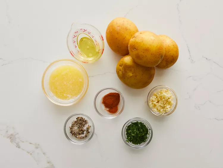 Cut 1/4-inch slices into each potato, making sure the knife only cuts through to the bottom 1/2-inch, keeping the bottom of potato intact. Combine butter, olive oil, garlic, and paprika in a small bowl.
